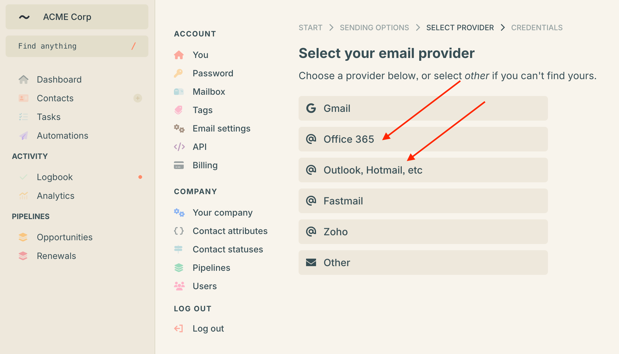 When logged in to your Wobaka account, head to Settings > Email settings and click on Office 365 or Outlook, Hotmail, etc depending on your Microsoft account type. You'll be redirected to approve access to Wobaka. After accepting you'll be ready to send emails with automations π!